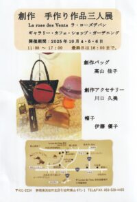 10/4(土)・5(日)・6(月) 手作り作品 三人展 創作アクセサリー・・・川口久美 創作バック・…
